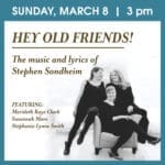 HEY OLD FRIENDS! An afternoon featuring the music & lyrics of Stephen Sondheim DATE: Sunday, March 8 TIME: 3:00 p.m. TICKETS: $25. Tickets available online, at the theatre box office, or by calling 503-436-1242. Join us for a heartfelt afternoon of song and story as three celebrated performers, Merideth Kaye Clark, Susannah Mars, and Stephanie Lynne Smith return… Read More.